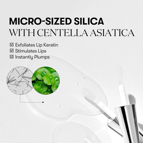Micro-seized silica with Centella Asiatica – Exfoliates lip keratin, stimulate lips and provides instantly plump.